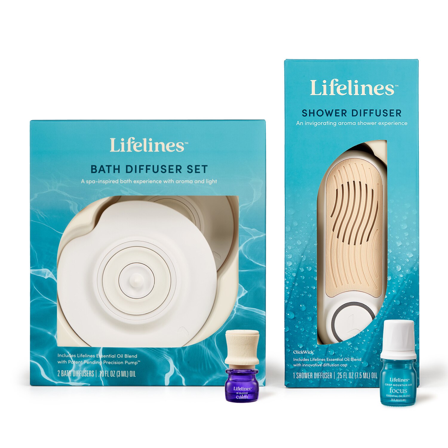 Lifelines "Unwind Your Body and Mind" Bundle - Shower Diffuser and Bath Diffuser Set plus Essential Oil Blends